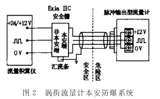 LUB系列渦街流量計(jì)防爆等級(jí)為ExiaⅡCT2~T4,它必須與已取得防爆合格證的本安關(guān)聯(lián)設(shè)備(防爆標(biāo)志:ExiaⅡC)配套組成本安防爆系統(tǒng)。如圖2所示。