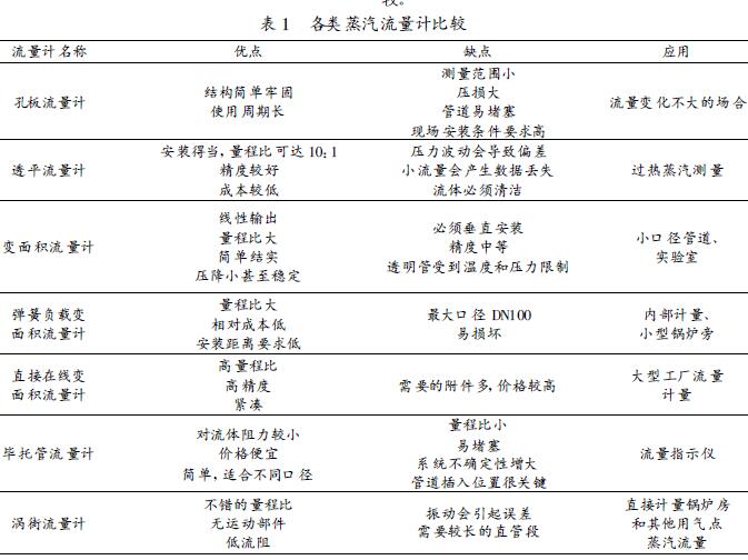 目前在工業(yè)上使用的流量計(jì)的類型非常多,其中適合蒸汽流量測量的流量計(jì)既有其優(yōu)點(diǎn),也有使用上的缺點(diǎn)。為確保蒸汽流量計(jì)的性能和精度,*重要的是選用的流量計(jì)要符合所使用的工況。表1對各類蒸汽流量計(jì)的優(yōu)缺點(diǎn)和應(yīng)用情況進(jìn)行了比較。