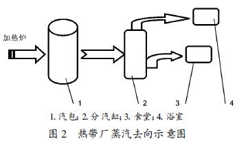 熱帶廠目前使用的蒸汽主要由加熱爐爐內(nèi)管道汽化產(chǎn)生,蒸汽過渡儲存在汽包中。設(shè)計(jì)要求汽包工作壓力為0.50~0.80MPa,正常工作壓力為0.70MPa左右。汽包產(chǎn)生的蒸汽流量為3.0t/h。蒸汽通過DN100的管道輸送,蒸汽終端用戶為食堂和浴室,蒸汽主要用于加熱。圖2對熱帶廠的蒸汽去向作了簡單的說明。