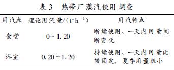 熱帶廠蒸汽使用量從一天的時(shí)間段來看,存在著用量大小變化大、短時(shí)間集中用汽、大部分時(shí)間用汽小而均勻的特點(diǎn)。按季節(jié)來看,冬季的用汽量要明顯大于夏季。表3對熱帶廠的蒸汽使用情況作了簡單分析。