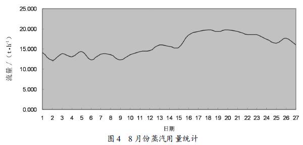抗振型渦街蒸汽流量計(jì)使用一個(gè)月,對數(shù)據(jù)進(jìn)行收集和統(tǒng)計(jì),得到每天蒸汽用量(參見圖4)。