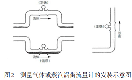 測量氣體或蒸汽時,渦街流量計安裝在水平管道上,配管時應注意防止液體滯留,渦街流量計應安裝在管線的較高處或將裝有渦街流量計的管段抬高。渦街流量計安裝在垂直管道上,流向不限,若被測氣體中含有少量的液體,氣體流量應由下向上,如圖2所示。