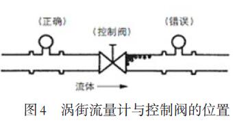 控制閥應安裝在渦街流量計的下游,這樣可解決液體流過控制閥時,因壓力下降而產(chǎn)生氣泡的不良影響,見圖4。渦街流量計安裝于水平管道時,當被測介質溫度大于200℃時,變送器一定要表頭向下安裝。