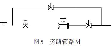 為了方便地檢查和清洗流量計(漩渦發(fā)生體),安裝如圖5所示的旁通管道。對于初次投運或管線設備檢修后,開車時應先使工藝介質走旁路24小時,待介質干凈時開表,以防變送器被異物阻塞或變送探測器被損壞。