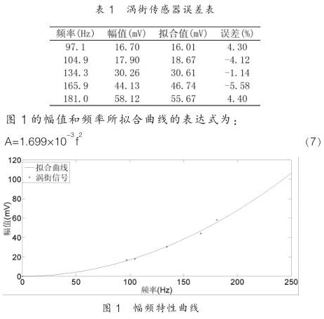 其中 K 1 為儀表系數(shù), D 為管道直徑。在管道口徑 D 不變,流體密度不變的情況下,渦街傳感器的輸出幅值與 f 2 成正比,具體表達(dá)形式可以根據(jù)實(shí)驗(yàn)測(cè)出。本文以 50mm 口徑氣體實(shí)驗(yàn)為例,數(shù)據(jù)如表 1 所示: