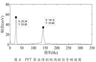 圖 4 是用 FFT 算法對(duì)渦街時(shí)域信號(hào)分析后得到的頻譜圖,其中渦街信號(hào)頻率為 141.8Hz ,振動(dòng)噪聲信號(hào)頻率為 25.34Hz 。從圖中可以看出,信號(hào)是稀疏的,稀疏度 K=2 。