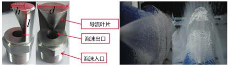 圖 1 為電弧風(fēng)扇噴嘴的結(jié)構(gòu)和噴霧,一種新型的噴嘴主要由一個dn65渦街流量計入口、出口和導(dǎo)流葉片組成。出流口的圓柱形設(shè)計降低了湍流強(qiáng)度。導(dǎo)流葉片類似于流線型尾部,產(chǎn)生類似于弧形風(fēng)扇形狀的dn65渦街流量計噴霧,其形狀類似于掘進(jìn)機(jī)的粉塵源。