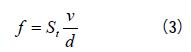 式中:f為渦街頻率,Hz;tS為斯特羅哈爾常數(shù)(無量綱);v為流體經(jīng)過發(fā)生體時的平均流速,m/s;d為發(fā)生體的特征寬度,m。