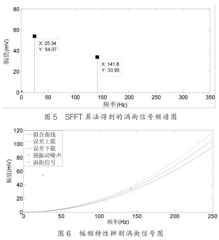從圖 5 可以看出 SFT 算法能夠很好恢復(fù),對(duì)渦街信號(hào)的頻率恢復(fù)沒有誤差,而幅值的誤差不超過 1% ,這對(duì)含有強(qiáng)振動(dòng)噪聲的渦街信號(hào)精確測(cè)量至關(guān)重要;圖 6 是經(jīng) SFT 頻譜分析所得到的數(shù)據(jù)通過幅頻特性曲線來辨別是噪聲信號(hào)還是渦街信號(hào)。通過幅頻關(guān)系的信號(hào)處理方法可以從含有振動(dòng)的混合信號(hào)中識(shí)別渦街信號(hào),從而達(dá)到提高二氧化碳計(jì)量表抗振動(dòng)性能的目的。