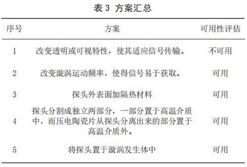 3)查找沖突矩陣,得到如下發(fā)明原理:No.32 改變顏色、No.19 周期性作用、No.24 中介物。方案一:依據(jù)No.32 改變顏色發(fā)明原理,得到解如下:改變透明或可視特性,使其適應(yīng)信號(hào)傳輸。方案二:依據(jù) No.19 周期性作用,得到解如下:改變漩渦運(yùn)動(dòng)頻率,使得信號(hào)易于獲取。方案三:依據(jù) No.24中介物,得到解如下:探頭外表面加真空絕熱材料。