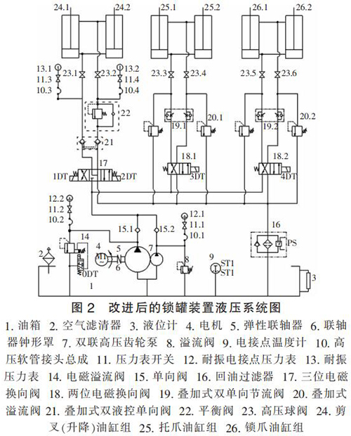根據(jù)丙烷氣流量計在整個提升系統(tǒng)中的實際工況,對該裝置的液壓系統(tǒng)進行技術改進,運用液壓集成技術,現(xiàn)代節(jié)能理念,采用機電液一體化思路,改進設計出的新型液壓系統(tǒng)如圖 2 所示。