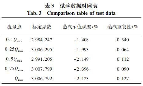 測試對象為同一臺表,DN80 口徑,帶有在空氣標(biāo)定裝置上的 5 點(diǎn)標(biāo)定系數(shù)。將管道介質(zhì)設(shè)定為過熱蒸汽,并預(yù)設(shè)溫度為 160 ℃ 和壓力 0. 4 MPa,以便儀表計(jì)算過熱蒸汽的密度。試驗(yàn)數(shù)據(jù)對照如表 3 所示。