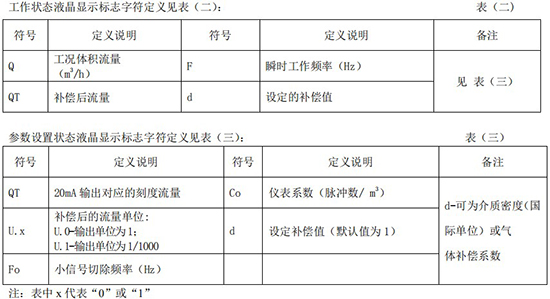 工作狀態(tài)液晶顯示標志字符定義見表(二):